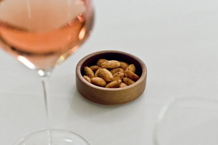 Wir starten mit einem Glas Champagner in den Abend. Dazu serviert man uns selbstverfeinerte Mandeln mit Curcuma, Zitrone und Ingwer.