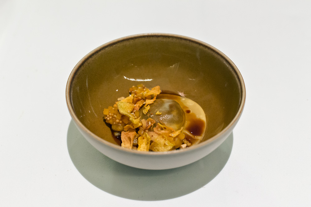 Wir befinden uns gerade in Ekstase und hoffen, dass dieser Abend noch lange nicht enden wird. Doch keine Angst, die Stucki-Brigade hat ebenfalls noch nicht genug und schickt mit dem hauchdünnen Raviolo, gefüllt mit geschmortem Entenschenkel, den nächsten Hochgenuss! Dazu gesellt sich das präsente Nelken-Aroma, dezente Zimt-Noten und der tiefe Enten-Jus – Umami-Power pur! Darüber legen sich eine leichte Kürbis-Note und das geniale Erdnuss-Aroma. Durch und durch grandios auch dank dem asiatischen Twist!