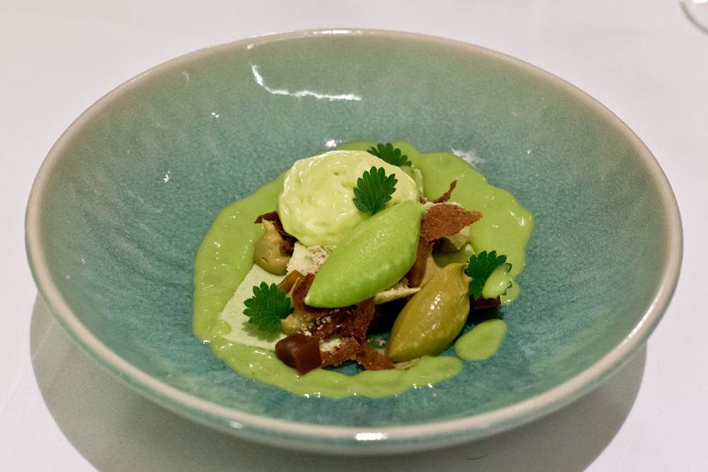 Der erste Gang des Menüs kann das extrem hohe Niveau des Amuses problemlos halten und unsere Begeisterung sogar noch steigern. Die kalte Vorspeise ist perfekt temperiert. Der Fisch von sehr guter Qualität und mit schönem Eigenaroma. Absolut genial ist die Kombination mit der mit Matcha gemischten Guacamole. Grandios auch wie sich ein eleganter, aber herausfordernder Säure-Teppich über das Gericht legt. Jeder Bissen ist eine Wohltat – für Nase, Gaumen und Seele. Absolut grossartig.