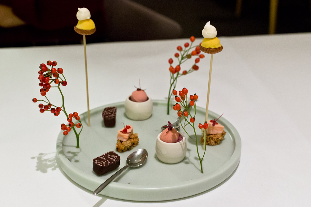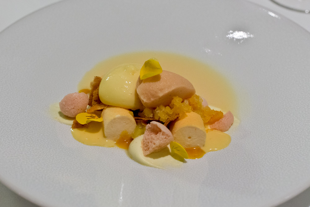 Mit dem Hauptdessert folgt dann eine rundum perfekte Süssspeise, wie sie leider viel zu selten serviert wird. Julien inszeniert die Zutaten ohne Effekthascherei in einer unglaublichen Harmonie. Zudem kombiniert er verschiedene Temperaturen und Konsistenzen zu einem traumhaften Dessert, mit einer hervorragenden Aromenvielfalt – von fruchtig, exotisch, würzig bis asiatisch anmutend dank des Sesam-Öls.