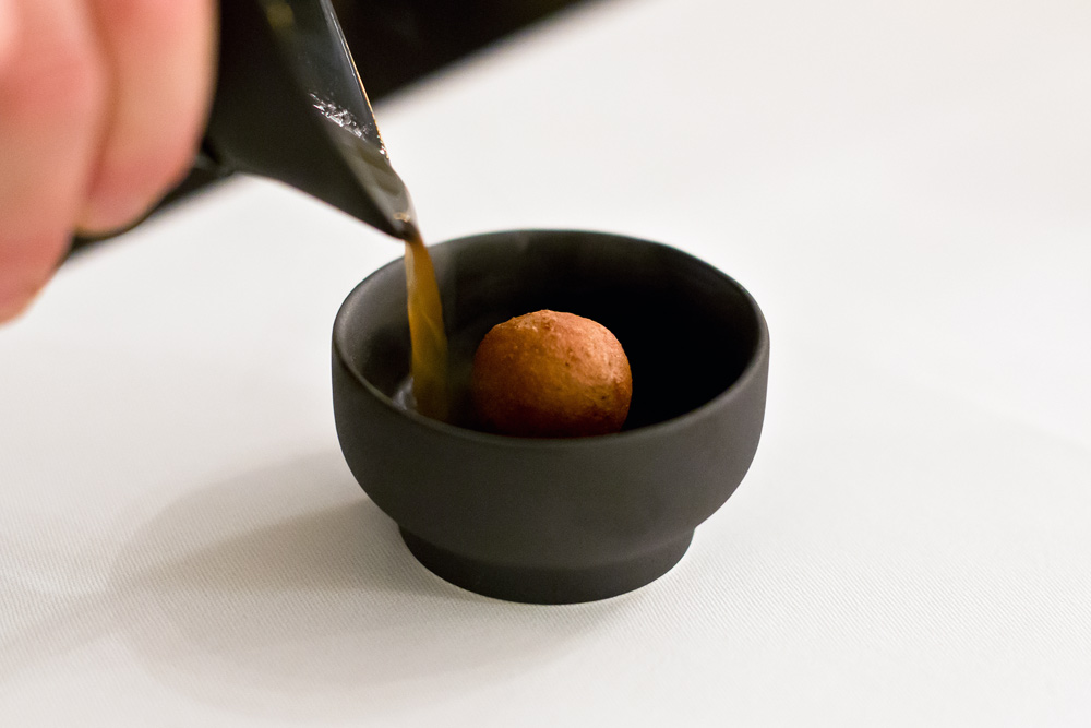 Amuse Bouche: Steinpilz-Sablè / Steinpilzessenz, Griesknödel und Pinienkernen (9/10)