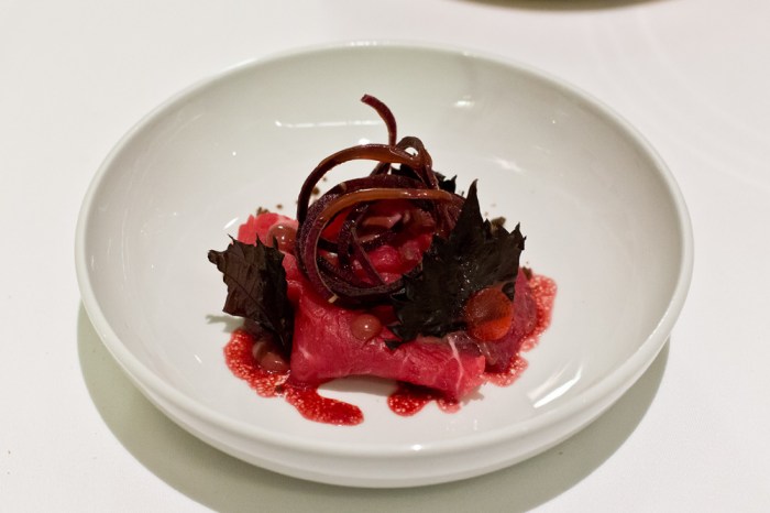 Die Kombination von vielen verschiedenen Zutaten ist immer eine Herausforderung und verlangt eine perfekte Dosierung, damit kein Akteur abfällt. Dass dies das Team um Tanja Grandits im Griff hat beweist es immer wieder. Das Gericht mit dem Rind ist indessen eine Ausnahme. Das rohe Rindfleisch hat nur einen leichten Eigengeschmack und mag sich gegen die restlichen Aromen nur sehr schwer behaupten. Dadurch geht das zarte Fleisch etwas gar stark unter. Abgesehen davon, zeichnet das Gericht ein schönes Geschmacksbild, bei dem wiederum die Süsse und die Säure in perfekter Balance stehen.