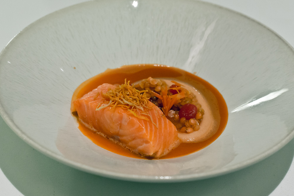 Saibling – Süsskartoffel Dashi, Piment d’Espelette, Rote Linsen (10/10)