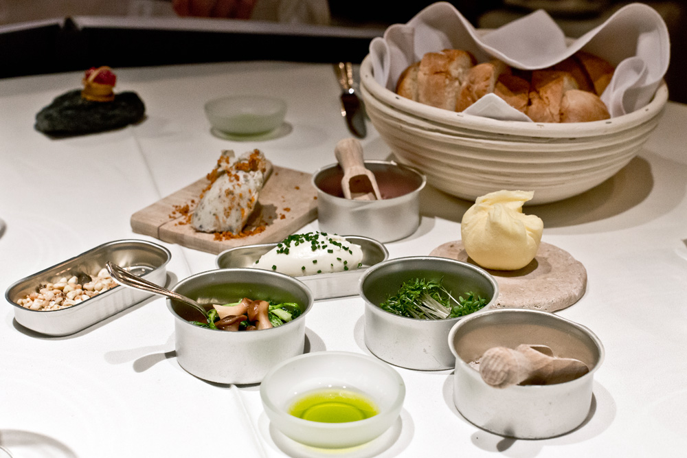 Auf das hausgebackene Brot ist man hier besonders stolz. Entsprechend spendiert man dem Gebäck auch eine würdige Kulisse. Neun verschiedene Toppings werden zum Gebäck gereicht. Dies reicht von Buttercrème mit Schnittlauch, über verschiedene Salze und Schweineschmalz bis zu einem mediterranen Aufstrich mit Kräuterseitlingen, Winterbroccoli und einer Tomaten-Ingwer-Knoblauch-Crème. Das schmeckt alles so wundervoll, dass wir uns sehr stark in Zurückhaltung üben müssen – wissen wir doch, dass uns gleich ein umfangreiches Menü erwartet. An vielen anderen Abenden wären wir schon alleine mit diesem Brot-Gang überglücklich.