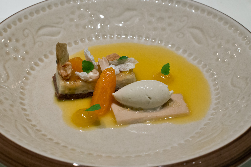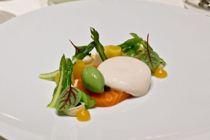 Dann folgt unsere erste Auswahl. Und die entpuppt sich bereits beim ersten Bissen als eine Wucht – wow, was für ein Aroma! Gabel für Gabel steigert sich bei uns das Glücksgefühl. Im Zentrum des Gerichts steht eine wundervolle Lachsforelle, verfeinert mit Kokosschaum mit einer genialen Zitronengrasnote. Das Sauerampferglacé sorgt für einen sehr erfrischen Twist. Das Gericht wird begleitet von himmlisch süsser Ananas in verschiedenen Konsistenzen und (leider) geschmacksneutralen Thai-Spargeln die dem Gericht nur ihre knackige Konsistenz beisteuern. Durch die verschiedenen, harmonischen Akteure, schmeckt jeder Bissen anders. Mal süss, mal frisch, mal lieblich – aber immer hervorragend!