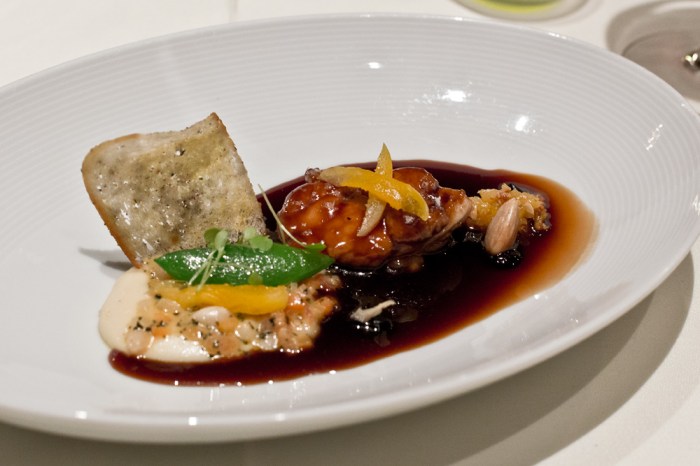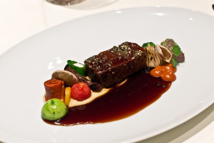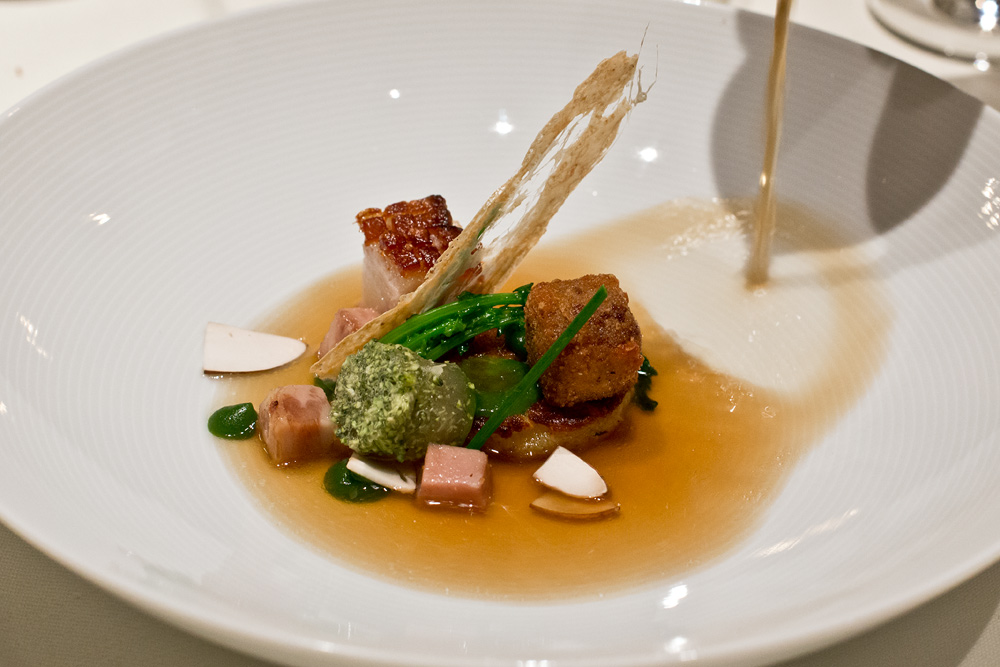 Bei den Suppen haben wir uns nur schweren Herzens gegen die Hummerbisque entschieden und dafür die „Schweinerei“ gewählt. Die Sau stammt von Holzen aus Ennetbürgen die für ihre Qualität gleich bekannt sind wie für die artgerechte Tierhaltung. Ott verwertet das ganze Schwein. So finden wir auf dem Teller verschiedene Stücke. Da ist zum Beispiel der geräucherte Rüssel, das Bäckchen in den frittierten Pralinen und Kinnfleisch. Den grossen Rest des Tieres findet man in der Consommé. Diese wird am Tisch aufgegossen. Dank den allesamt sehr gut zubereiteten Stücke offenbart sich am Gaumen ein intensiver, animalischer Geschmack. Einzig die Consommé dürfte noch etwas wuchtiger sein um damit für noch mehr Intensität zu sorgen.