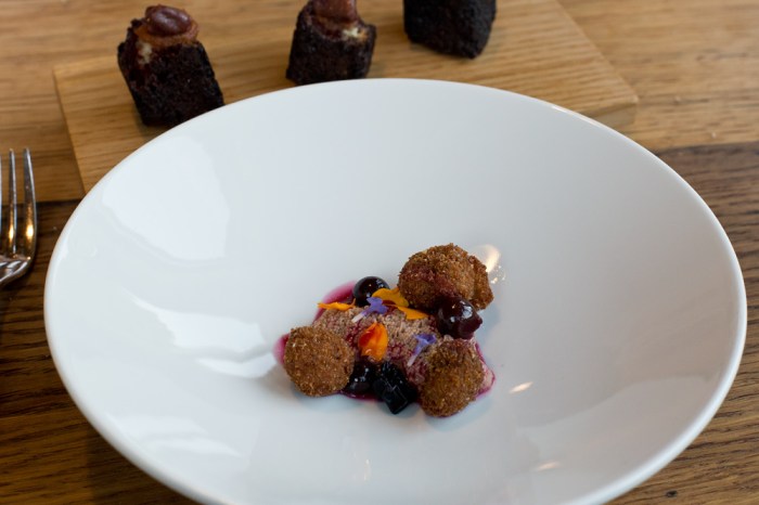 Da man hier im Regino Montium möglichst das ganze Tier verwertet, wird in jedem Menü ein Innereiengang serviert. Während uns Gastgeber Gregor die Gänge bis anhin sehr ausführlich annonciert, wird dieser Teller lediglich mit einem Schmunzeln hingestellt und uns viel Genuss gewünscht. Wir müssen also selber herausfinden was uns die Küchenbrigade zubereitet hat – wir nehmen die Challenge gerne an. Zuerst probieren wir eines der gebackenen Bällchen. Es schmeckt ganz leicht nach Fisch. Beim Abgang machen wir einen dezenten Geschmack nach Innereien aus – jedoch nach etwas ganz leichtem, für uns Unbekanntem. Die Crème in der Mitte ist Leber. Sie ist aber zu wuchtig um von einer Ente oder Gans zu stammen und zu wenig animalisch für eine Schweinsleber. Wir tippen auf Kalb. Zusammen mit den säurespendenden Trauben und den Waldhimbeeren ist dies ein erster wunderbarer Herbstbote.