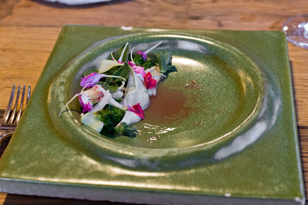 Ganz grosses Kino dann der unter der Porzellan-Cloche servierte Egli aus dem Zugersee. Kaum ist die Cloche angehoben verbreitet sich am Tisch eine traumhafte Rauchnote vom Baumnussholz. Das Raucharoma hat sich auch wunderbar ins Fleisch eingearbeitet ohne penetrant zu wirken. Der Fisch schmeckt ausgezeichnet. Auch der gebratene Brokkoli ist eine Wucht, vor allem die Stellen die richtig viel Hitze bekommen haben. Das schöne Grillaroma gibt dem Gericht einen weiteren Kick. Applaus auch für den genialen Nelkensud mit Himbeeressig – von der süss-sauren Note profitiert das ganze Gericht. Auch sehr cool der knackige Eiskristallsalat mit seinem frischen Aroma. Davon könnten wir eine ganze Schüssel essen.