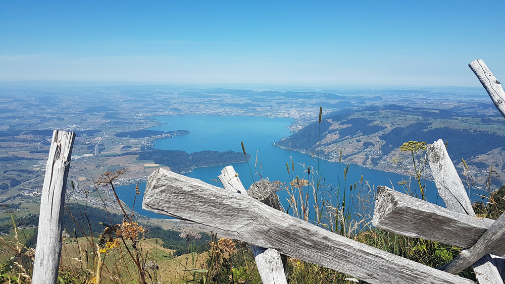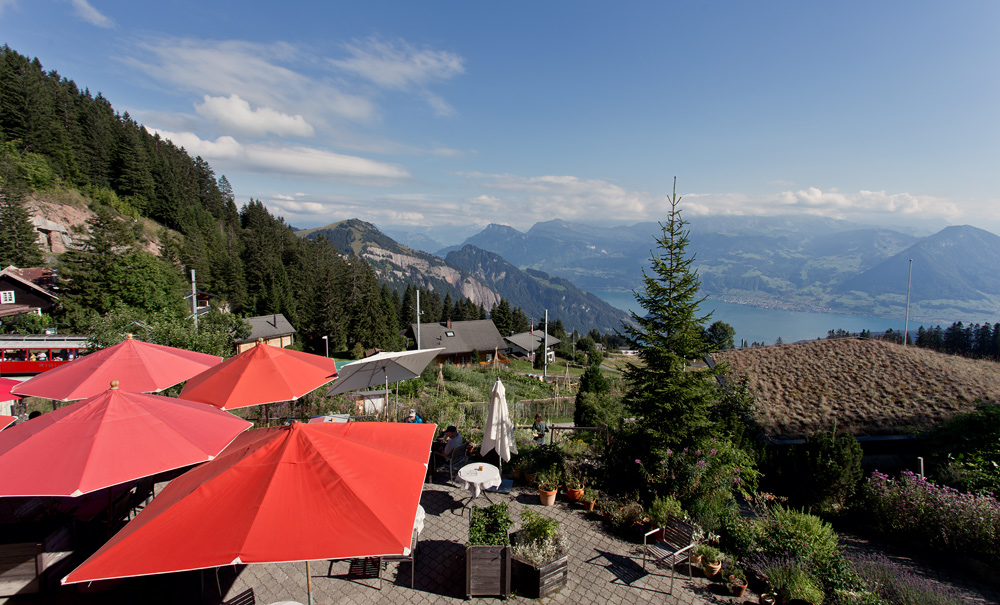 Während am Abend ausschliesslich die Gourmet-Karte aufliegt, gibt es am Mittag lediglich die Panorama-Speisekarte. Ob feiner Schmorbraten vom Bio-Rigi-Rind, geschmolzener Käse mit Kartoffeln, den Rigi-Burger oder verschiedene Crêpes und Gallettes, alles wird frisch zubereitet. Gegessen wird bei gutem Wetter auf der grossen Terrasse mit fantastischer Aussicht. Das Wetter war heute traumhaft. Auf dieser Höhe wird es am Abend aber auch an den heissesten Sommertagen frisch. Die Temperatur reicht noch um den Apéro hier draussen zu geniessen, danach wird es frisch. Eine Wohltat nach dieser Sommer-Hitzeperiode mit Tropennächten.