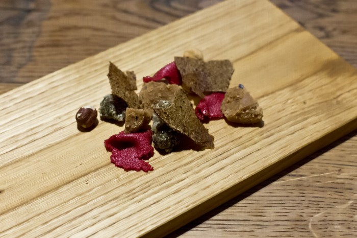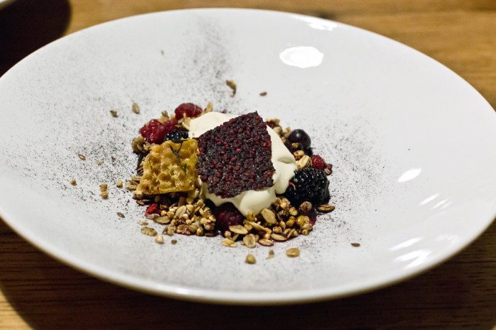 Der Name des Desserts ist in Anführungszeichen geschrieben weil es keine weisse Schokolade enthält, sondern Honigglace welche mit Tannenschössling-Butter abgeschmeckt wurde. Und diese Kombination schmeckt überraschenderweise tatsächlich intensiv nach weisser Schokolade. Zu dieser süchtig machenden Crème serviert man uns extrem reife Beeren wie man sie nur aus dem eigenen Garten bekommt. Sogar die Waldbrombeeren und Stachelbeeren schmecken hier richtig süss. Zusammen mit den verschiedenen Cerealien entsteht dieses hervorragende Dessert mit viel Geschmack und schönen Texturen.
