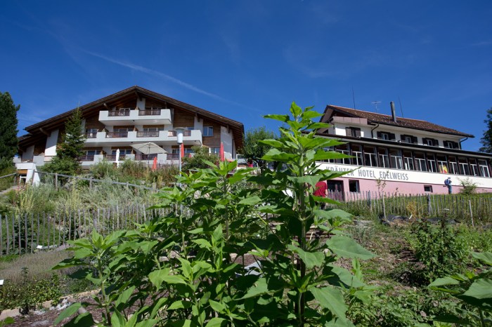 Schwitzend erreichen wir um siebzehn Uhr das Kräuterhotel Edelweiss, in dem sich das Sternerestaurant befindet. Vor dem Haus auf 1550 Meter über Meer hält gerade eine Zahnradbahn an der Station „Rigi Staffel Höhe“ mit erfrischend dreinblickenden Touristen. Direkt unter dem Hotel befindet sich ein grosser Kräutergarten mit 400 (!) verschiedenen Pflanzen. Diese werden später am Abend noch eine wichtige Rolle spielen. Doch zuerst checken wir im einfachen Hotel ein. 19 Zimmer stehen den Gästen zur Verfügung. Unser Doppelzimmer wurde erst kürzlich mit frischem Holz neu teileingekleidet und duftet entsprechend himmlisch. Auf dem Balkon, mit Blick auf das atemberaubende Rigi-Panorama, wartet bereits ein Zuber mit einem Fussbad mit Kräutern vom eigenen Garten. Was für eine Wohltat für die in Mitleidenschaft gezogenen Füsse.