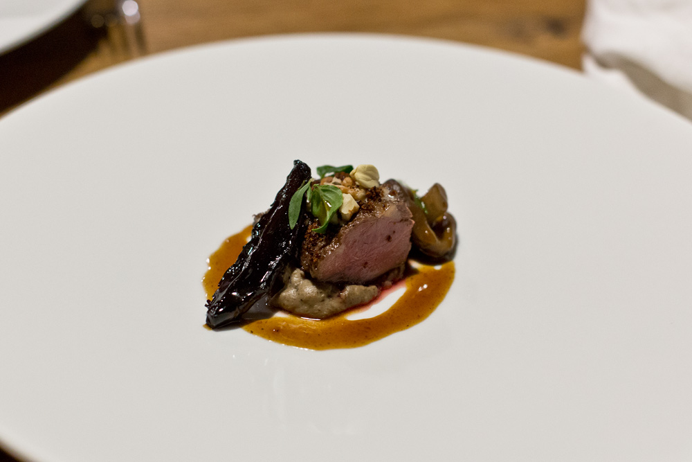 Der nächste Gang ist Gregors Götti zu verdanken. Er hat nämlich im Zürcher Weinland diese Wildsau geschossen und sie auf die Rigi zum Verarbeiten gebracht. Das Fleisch ist sehr zart und harmoniert sehr gut mit den knusprigen Baumnüssen, den wunderbaren Pilzen (ein Teil des Geschmacks vom Pilzkraut) und in der Melasse kandierten Topinambur. Einzig der Jus dürfte gerne noch etwas mehr Power haben.
