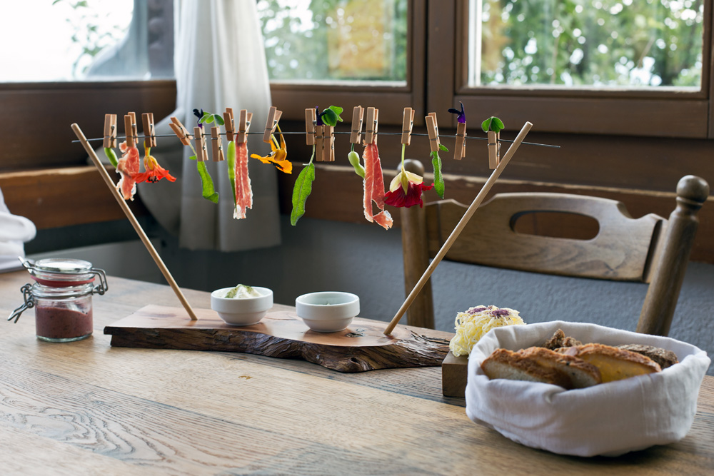 Zum selber hergestellten Rosen- und Nelken-Mousseux gibt es das hausgemachte Sauerteigbrot. Dazu Anke von der Alp Trib und Geissenfrischkäse-Schaum mit Kapuzinerkresse-Pulver. An einer Leine hängen Kräuter vom Garten und Fleisch von der Rigi. Wir finden daran extrem intensive Oxalis, peruanische Salbeiblüte, Pastrami vom Rigi Bio und die bereits auf der Terrasse servierten Kapuzinerkresse-Blüte mit Frischkäse und Raps-Saat.