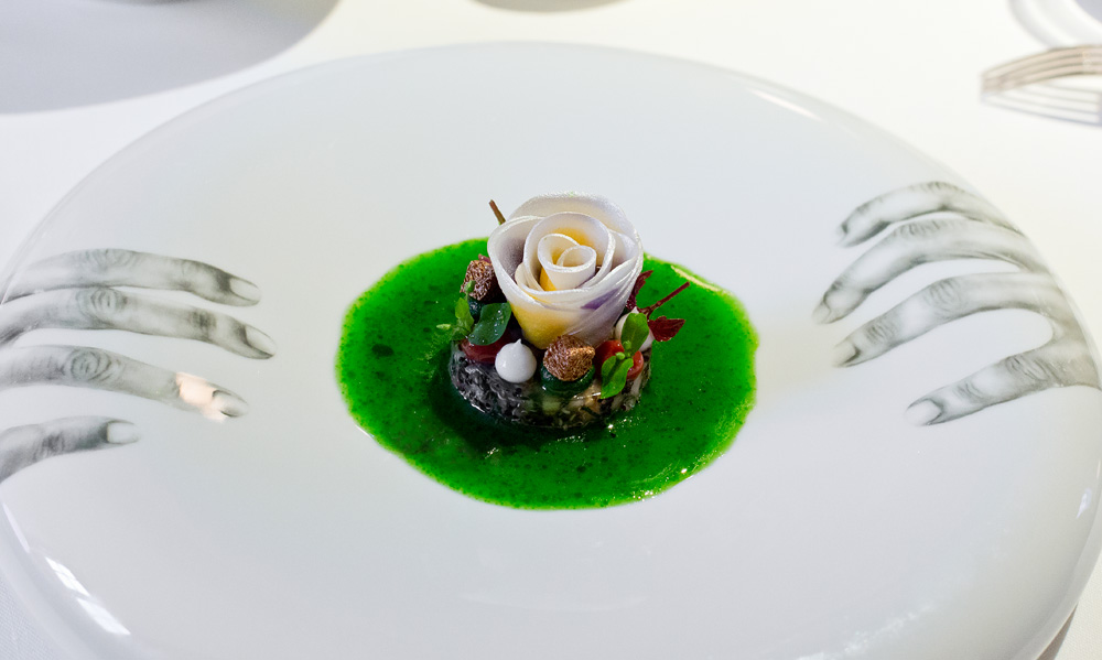 Das Amuse Bouche ist eines der am schönsten angerichteten Gerichte die wir jemals serviert bekommen haben. In die Rettich-Rose wurden noch sorgfältig Veilchen-Blüten eingearbeitet. Dass das Gericht auch geschmacklich begeistert, schmecken wir, als wir den ersten Ecken des Quinoa-Salats abschneiden und es durch den grossartigen Basilikum-Apfel-Sud ziehen. Es schmeckt fantastisch und sorgt gleich für Gänsehaut – wow! Auch das restliche Gericht schmeckt extrem frisch und dank den verschiedenen Kräutern, der Minze, Soja und Wasabi auch äusserst abwechslungsreich. Auch hier wurde wieder alles mit viel Mut abgeschmeckt – sogar der Quinoa hat eine angenehme Schärfe.