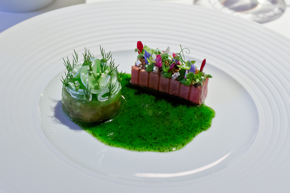Der erste Gang des Menüs legt optisch sogar nochmals eine Schippe drauf. Das Gericht duftet zudem himmlische nach Sommer – dies wegen dem wundervollen Gurken-Sud mit schwarzem Olivenöl und Zitronenöl. Der Thunfisch hat in zwei Varianten seinen Auftritt. Zum einen als Tatar und daneben als scharf angebratene Variante mit farbigem Topping aus verschiedenen Kräutern, Peperoni und Kartoffeln.