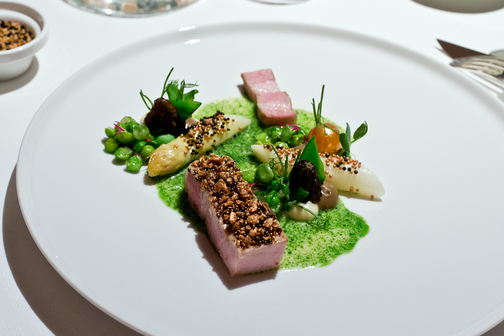 Auch der Hauptgang begeistert! Kaum auf dem Tisch riecht es intensiv nach Erbsen! Im Zentrum steht das hervorragende Luma Schwein – eines der besten Schweine-Fleisch-Stücke die uns jemals serviert wurden. Dank dem etwas grösseren Fettanteil und der guten Lagerung, kann das Tier seinen vollen Geschmack offenbaren. Die darauf liegenden Schweineschwarten-Crumble sorgen für eine angenehme knusprige Textur. Das Fleisch passt hervorragend zu den süsslichen Erbsen und den knackigen Spargeln. Schon alleine die hervorragende Sauce, bestehend aus Spargel-Misosauce mit Petersilienöl ist wiederum extrem wuchtig und hat eine schöne Säure. Die angenehme Säure ist auch bei den weissen Spargeln aus Diepoldsau vorhanden. Denn die weissen Stängel wurden in Zitrone eingelegt und sous-vide gegart. Das Ergebnis: Intensiver Geschmack, einen angenehme Säureanteil und einen perfekten Biss.