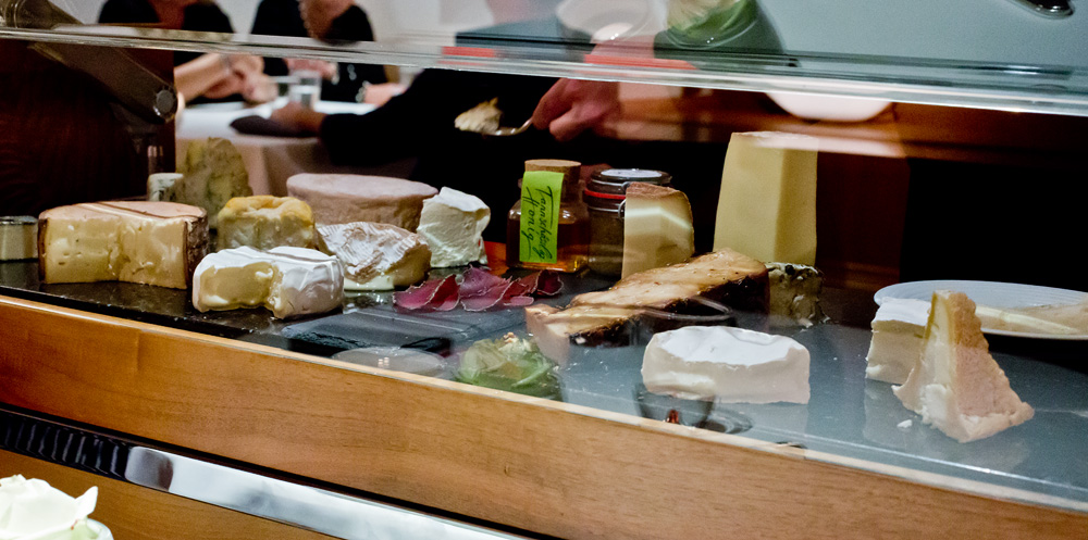 Den Käsewagen lassen wir nicht an uns vorbei rollen. Darauf finden wir eine überschaubare, aber sehr schöne Selektion an Käse aus Frankreich und der Schweiz. Dazu gibt es etwas Trockenfleisch, Früchtesenf, Honig sowie ein Nuss- und Früchtebrot.