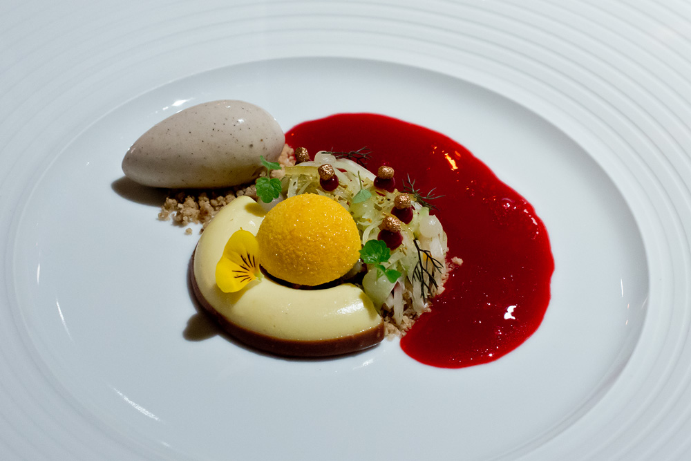 Auf das Hauptdessert haben wir uns besonders gefreut. Denn wir mögen es, wenn bei der Nachspeise auch Gemüse zum Einsatz kommt – wie hier der Fenchel. Das Gericht riecht dann auch sehr fein nach dem leicht ätherischen Gemüse. Daneben gibt es zweierlei von der Zitrone und als Aufguss einen kalten Rosen-Himbeer-Sud. Jedes Element auf dem Teller schmeckt sehr fein. Man schafft es aber leider nicht, dass die Zutaten ineinander verschmelzen. Zudem ist der Einsatz vom Crumble überproportioniert. Trotz dem ausgezeichneten Vanille-Glace kann das Dessert das hohe Niveau des vorherigen Menüs nicht halten.
