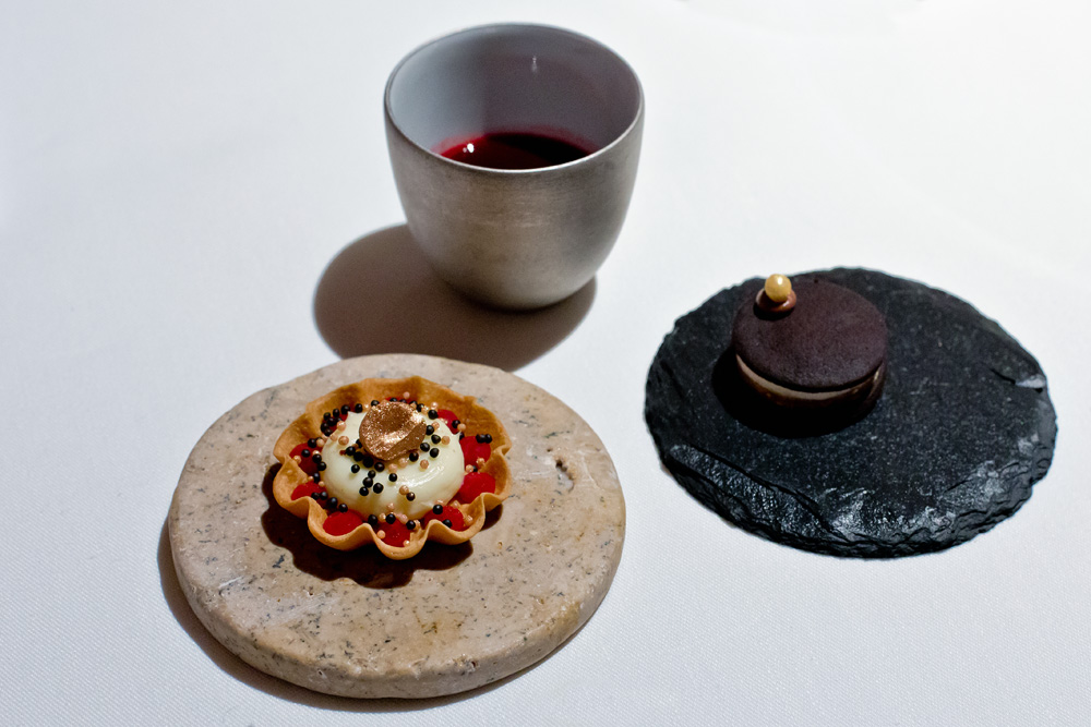 Ein etwas ausdrucksloses Cookie mit Baileyscrème, ein luftiges Tartelette mit Wachholdercrème und ein finessenreicher Shot aus Cassis-Buttermilch mit Minzöl schliessen das Menü ab.