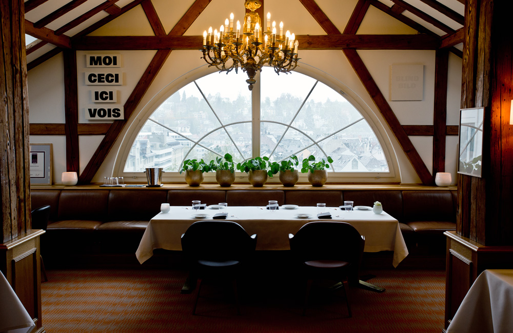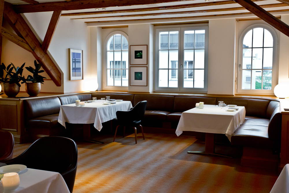 Wir sind sehr gespannt, wie sich das Restaurant und die beiden Chefs in den letzten vier Jahren entwickelt haben. Wir betreten das 4-Sterne-Hotel Einstein an einem regnerischen April-Tag. Letzte Woche war es bereits sommerlich warm, heute Nacht wird es hingegen schneien. Gleich hinter dem Hoteleingang finden wir den Lift der uns ins Gourmet-Restaurant im 5. Stock führt. Dort angekommen werden wir vom freundlichen Service-Team begrüsst und in einen der beiden Speiseräume gebracht. Das Restaurant ist seit unserem letzten Besuch etwas eleganter geworden, trotzdem wirkt es etwas schwer. Dafür ist die Stimmung sehr angenehm, die Tische stehen in grossem Abstand voneinander und das ganze Service-Team macht über den ganzen Abend einen super Job.