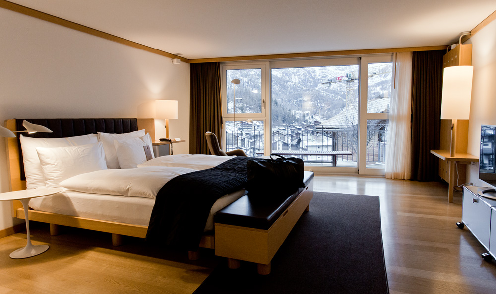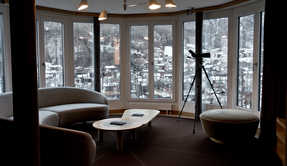 Wer sich etwas ganz Exklusives gönnen will, bucht die 90 qm grosse Tower Suite. Das Highlight der Suite: der Erker. Hier hat man einen unglaublichen Blick aufs Tal, das ganze Dorf und sogar aufs Matterhorn – mega! Neben dem grosszügigen Schlafzimmer verfügt die Suite über ein grosses Wohnzimmer mit Cheminée und zwei Badezimmern. Auf dem Balkon stehen mit Lammfell eingekleidete Stühle bereit. Falls es zu kalt wird, wärmt der Inhalt von der à discretion zur Verfügung gestellten Bourbon-Flasche.
