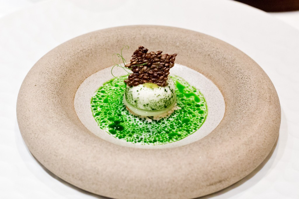 Das Amuse Bouche mit King Crab-Salat und Buttermilch (8/10) irritiert. Oder seit wann gibt es im Lago Maggiore Kingkrabs? Das Tier stammt natürlich aus dem Atlantik und kommt nur deshalb ins lokale Orto-Menü, weil man aus Kapazitätsgründen pro Abend ein einheitliches Amuse serviert. Auch wenn man die fehlende Stringenz bemängeln könnte: es schmeckt verdammt gut. Denn das fein gezupfte Fleisch des Krebses liegt in einer Buttermilchvinaigrette mit toller Dill-Note und erfrischendem Gurken-Gechmack. Darüber ein Mousse von der Buttermilch und ein knuspriger Leinsamen-Chip. Alles wird von einer perfekt dosierten Säure von der Yuzo (stammt aus dem eigenen Garten!) kontrastriert. Das schmeckt alles sehr frisch und passt perfekt in diesen schönen Spätsommer.