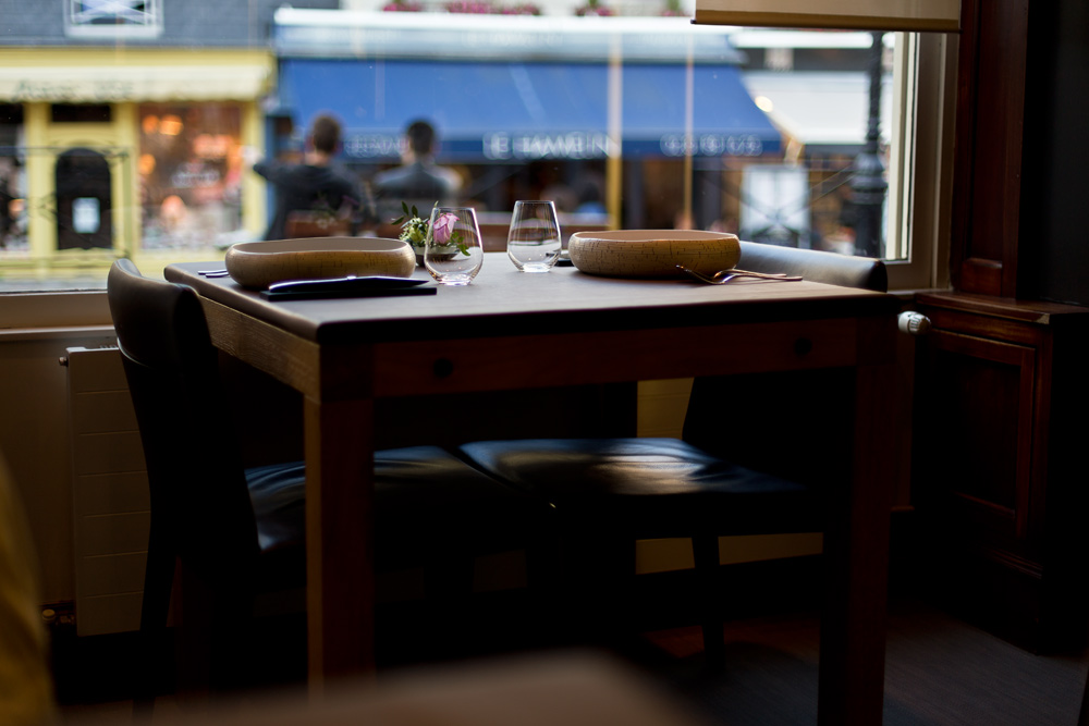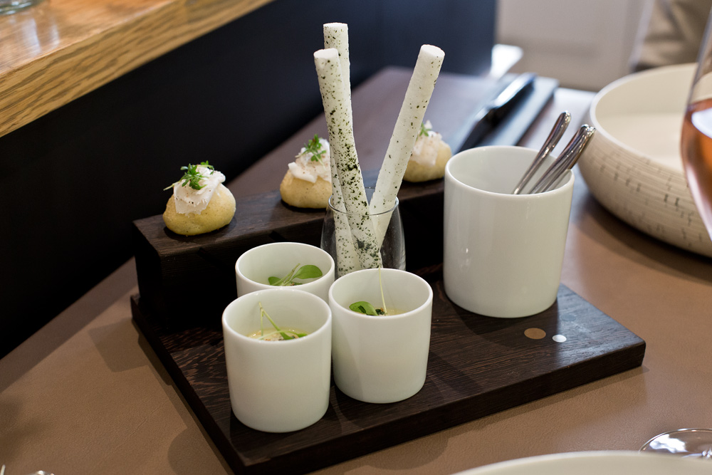 Nach und nach werden die Gäste um uns herum ins Restaurant begleitet. Irgendwann sind alle weg – auch das Servicepersonal. Wir warten noch ein paar Minuten und entscheiden dann, dass wir den Weg an den Tisch selber finden. Dies bleibt der Dame am Empfang nicht verborgen. Sie fängt uns ab und begleitet uns an den Tisch. Zuvor dürfen wir aber noch einen kurzen Blick in die Küche werfen. Hier ist die grosse Brigade mit voller Konzentration am Werk. Sébastian Bras steht am Pass und nickt uns freundlich zu. Wir betrachten die vollen Pfannen und die frischen Produkte und wollen dann möglichst rasch an den Tisch um all die Leckereien endlich essen zu dürfen. Unser Tisch steht ganz hinten im länglichen Restaurant und ist mit einem weissen Spannleintuch gedeckt. Von jedem Tisch hat man eine gute Sicht nach draussen – wobei die Aussicht hier nicht mehr ganz so schön ist wie noch vorhin in der Lounge. Uns gefällt das Restaurant, verlieben werden wir uns aber nicht. Dafür wirkt das Interieur zu erzwungen. Auch die Servicemitarbeiter, in ihren zu grossen dunkelblauen Uniformen, wirken eher wie Automechaniker. Aber zum Glück sind wir weder wegen dem Interieur noch wegen dem Schnitt der Mitarbeiterbegkleidung hierhergekommen.