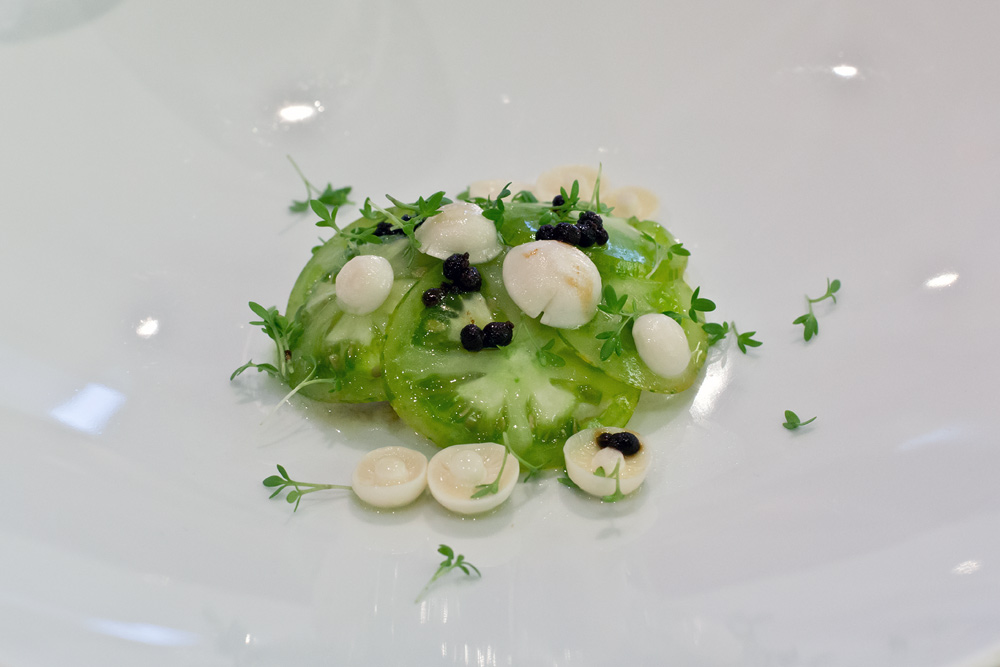 Die Foie Gras treffen wir aktuell nur noch in etwa jedem fünften Gourmet-Menü an. Und dann hat sie ihren Auftritt meistens bei den Apéro-Häppchen als winziges Element. Entsprechend überrascht sind wir als man uns dieses stolz portionierte Exemplar auftischt. Einen solch kompromisslosen Auftritt erlebten wir zum letzten Mal vor vier Jahren in The Fat Duck in Bray. Die Assoziation entsteht nicht nur wegen der Grösse, sondern auch wegen dem Geschmack. Seit der Foie Gras bei Heston Blumenthal, sowie einer unvergesslichen Variation bei Andreas Caminada auf Schloss Schauenstein, haben wir nie wieder einen solchen Hochgenuss erlebt. Die Leber schmilzt förmlich auf der Zunge und hat einen traumhaft edlen Geschmack. Für den süssen Kontrast sorgt ein weisser Pfirsich mit vietnamesischem Koriander. Der delikate Heidelbeer-Essig sorgt für eine leichte Säure.