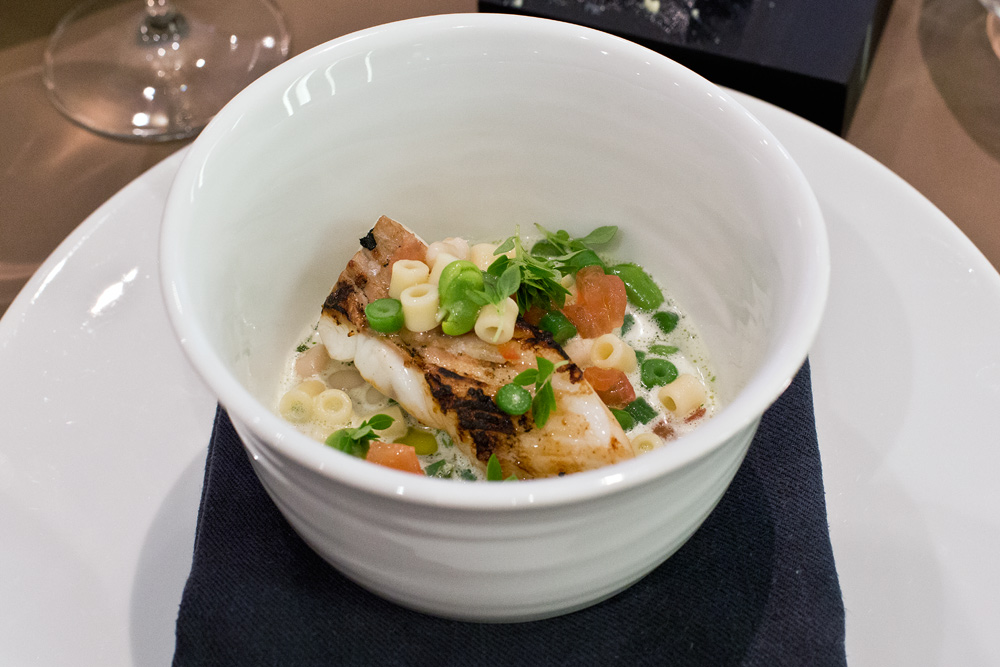 Ein Amuse Bouche scheint in französischen Restaurants keine Selbstverständlichkeit. In den meisten auf unserer Reise besuchten Sternerestaurants gab es keines. Hier setzt man glücklicherweise auf den „Gruss aus der Küche“ und bereits nach dem ersten Bissen sind wir unendlich dankbar dafür. Die Gemüsesuppe (am prominentesten schmeckt sie nach Spargeln) ist sommerlich kühl und absolut fantastisch im Geschmack. Darauf liegt ein knuspriges Buttergebäck mit einem intensiven Kräuter-Basilikum-Mousse, etwas fein geschnittener Kabeljau sowie würzige Blumenblätter. Ein optisch simples Gericht mit einem hervorragenden Geschmacksbild welches die Messlatte sehr hoch steckt.
