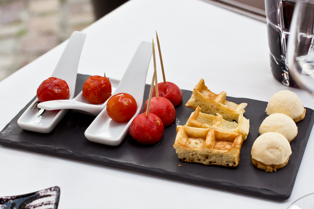 Während wir den Apéro und den Blick in die Natur geniessen, werden die ersten Häppchen [9/10] serviert.
