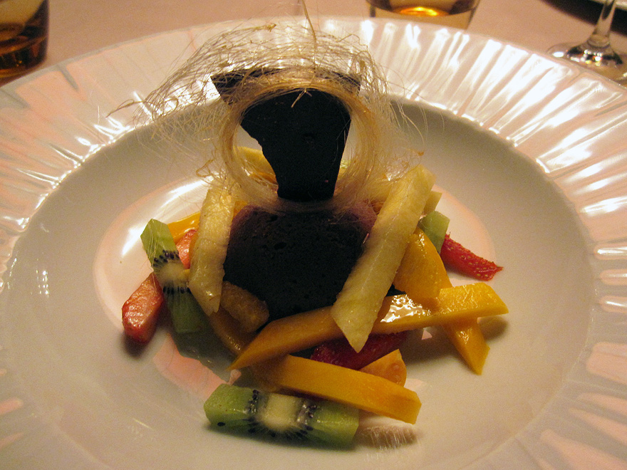 Optisch ist der Schokoladen-Monolith nett, geschmacklich kommt aber auch das Dessert nicht über ein okay hinaus. Das Schokoladenmousse geriet so mastig, dass man spätestens nach der Hälfte genug hat. Es fehlt auch klar an Abwechslung und Kontrasten. Dies ist nach dem Hauptgang und der Leber bereit der dritte Teller der nicht leergegessen wieder abgeräumt wird.