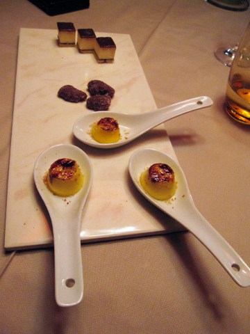 Während sich in den nächsten Minuten die Tische um uns herum alle füllen, erhalten wir auf einem silbernen Löffel ein erstes Häppchen: