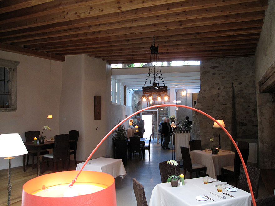 Nach einer Viertelstunde befinden wir uns auf einer engen Landstrasse. Die Abstände zwischen den einzelnen Häuser werden immer grösser. Zudem zieht ein mystischer Nebel auf. Wir sind fest überzeugt, dass wir uns verfahren haben, wollen aber die verbleibenden drei Minuten weiter fahren. Und tatsächlich, aus dem Nichts taucht auf einmal ein hübsches Anwesen auf. Obwohl der kleine Zeiger auf unserer Uhr auf die Acht zeigt, sind alle Parkfelder vor dem Restaurant verwaist. Vor der Holztüre prangt eine Tafel von „Jeunes Restaurateurs d’Europe“, drinnen brennt Licht. Hinter den grossen Fenstern erspähen wir weiss aufgedeckte Tische. Wir versuchen die grüne Restauranttür zu öffnen – diese ist aber verschlossen. Wir betätigen die Klingel und hören von innen Schritte auf uns zukommen.