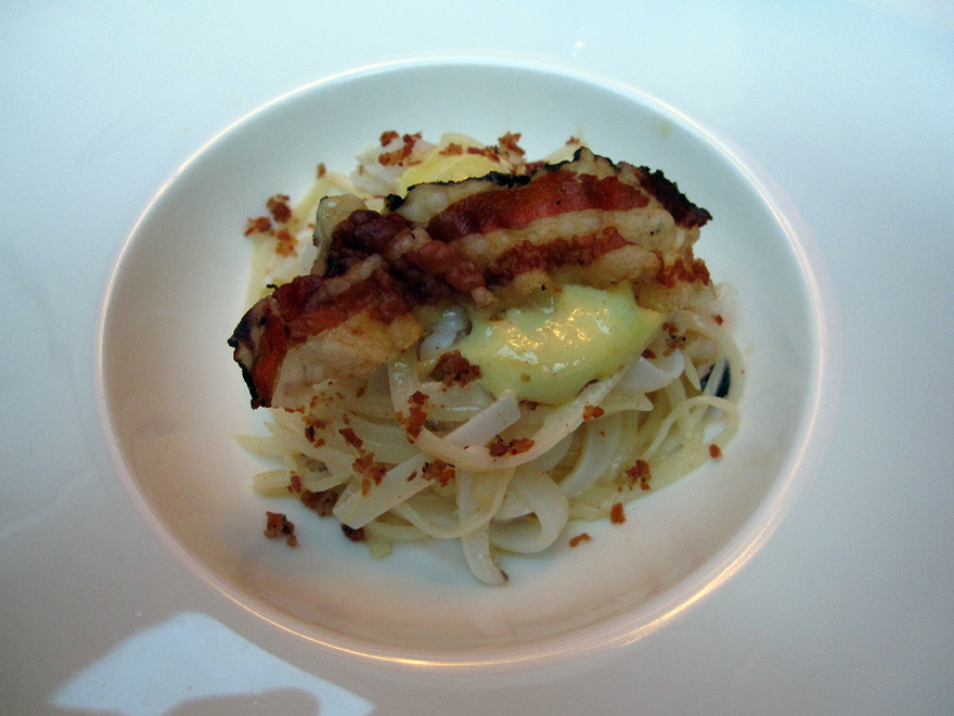 Pancia di vitello arrostita lentamente, purè di sedano rapa, salsa alla „California“, mosto ridotto [-/10]