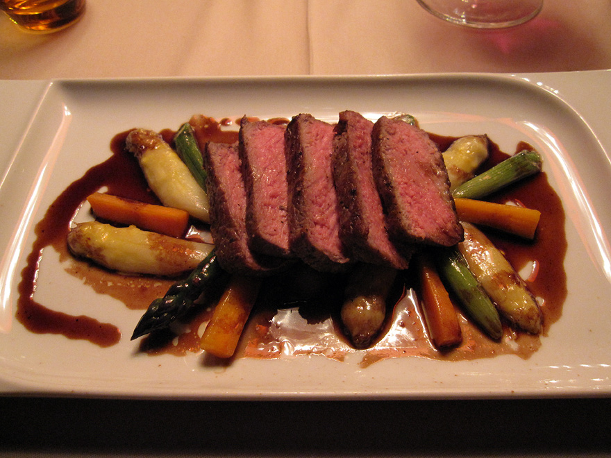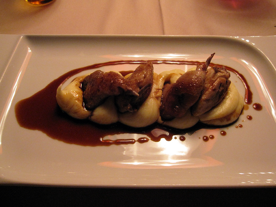 Uninspiriert geht es weiter. Die aufgeschnittene Entenbrust hat zwar ein ansprechendes, rauchiges Aroma, die Tranchen können aber mit dem schlecht geschliffenen Messer unmöglich zerschnitten werden. Die Entenleber obendrauf versagt komplett. Sie schmeckt total wässrig.