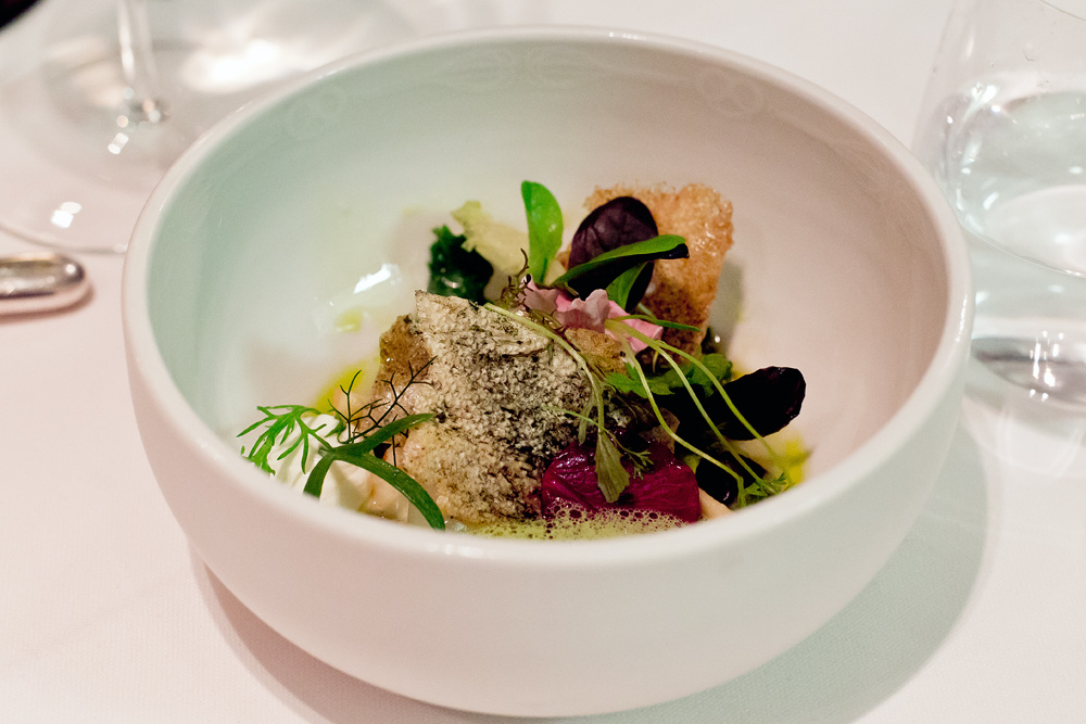 Wir schmecken das Palmherz, einen leichten Kokosgeschmack und das eindrückliche Aroma der Krabbe. Ein rundum schöner Gang. Der einzige Kritikpunkt ist die Ähnlichkeit zum Amuse Bouche – in unseren Augen hätte deshalb ein anderes Amuse serviert werden sollen.