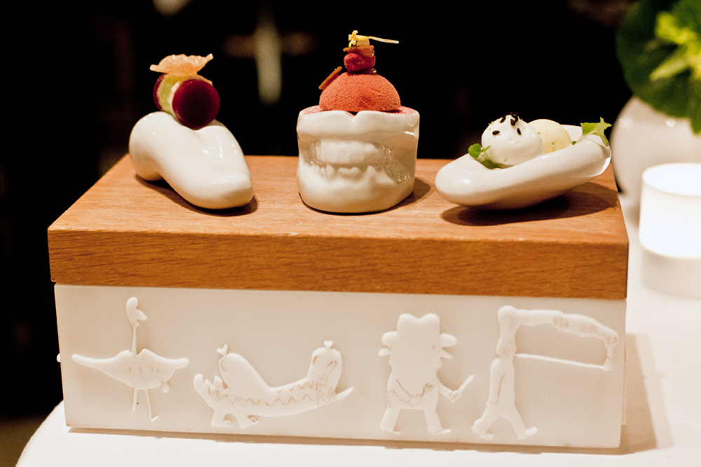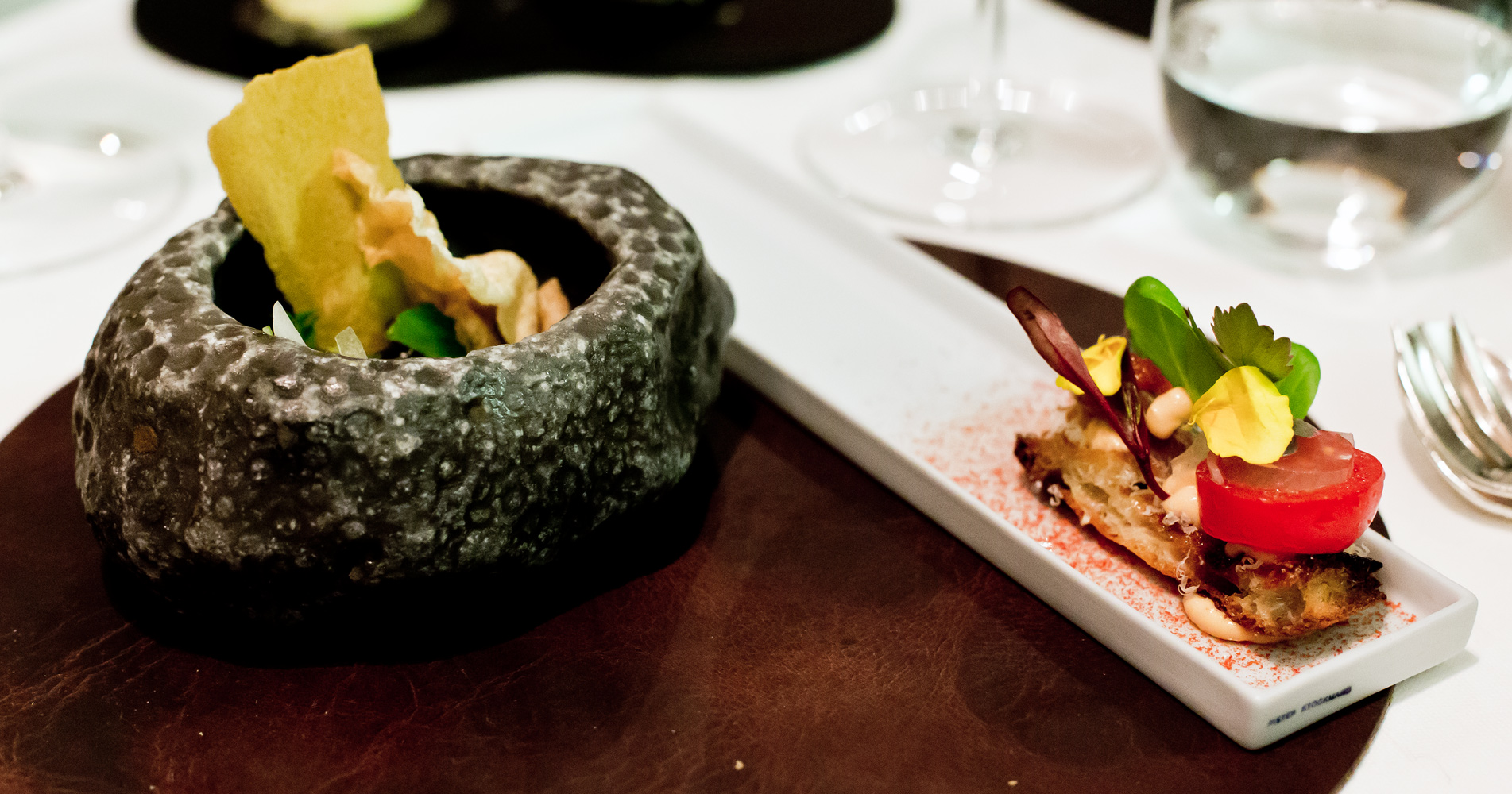 Wir heben den kleinen Porzellandeckel und finden darunter dünn aufgeschnittenen Tintenfisch, dekoriert mit gelben Tapioca Kügelchen. Der Tintenfisch ist ein Tick zu gummig, die Tapioca Perlen haben zwar einen würzigen Geschmack, sind beim zerbeissen aber überhaupt kein Genuss – da sie nicht wie Kaviar zerplatzen, sondern an den Zähnen kleben. Auf voller Linie überzeugt dann aber der aromatische Lobster. Dieser liegt unter der restlichen Komposition und ist von sehr hoher Qualität.