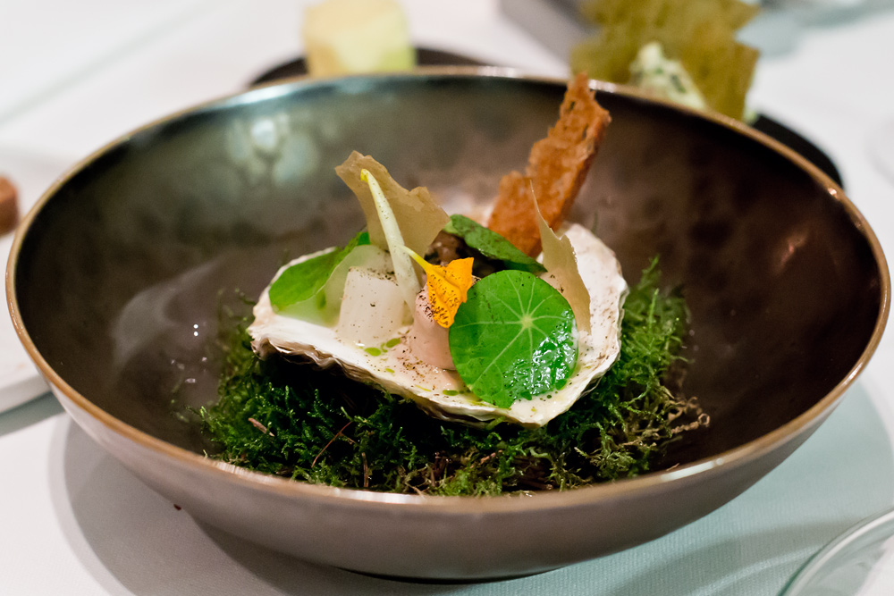 In einem kleinen Porzelanschälchen wird uns eine intensive, sehr harmonische Austernconsomé mit etwas Tofu serviert. Der Geschmack ist noch Minuten später in unserem Gaumen allgegenwärtig. Ein schöner Start.