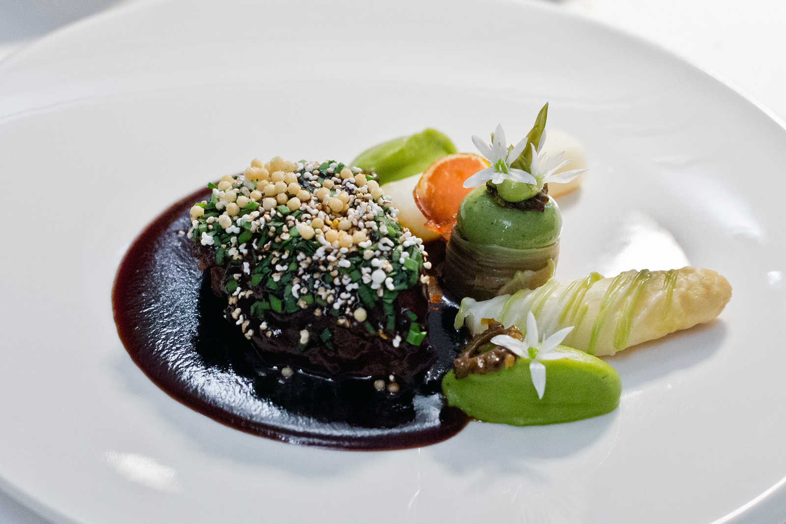 Während viele Köche ihre Gerichte reduzieren, geht Robert seinen eigenen Weg und dieser ist geprägt von seiner Zeit in den Niederlanden, wo aufwändige Gerichte in der Spitzengastronomie noch immer en vogue sind. Das zeigt er auch beim ersten Gang das eigentlichen Menüs: Lachs, mit Sellerie, Apfel und Meerrettich (7/10). Wunderschön angerichtet und ein frisches Geschmacksbild, dass an den Klassiker „Geräucherter Lachs mit Meerrettich“ erinnert. Das Gericht hat eine schöne Säure und dank dem Meerrettich eine angenähme Schärfe. Einzig der Namensgebende Lachs taucht etwas unter. Der Einsatz von etwas Lachs-Rogen wäre bestimmt eine Bereicherung und sollte bei der Weiterentwicklung in Erwägung gezogen werden Aber auch so ist dies eine starke und erfrischende Komposition. Gar auf zwei Sterne-Niveau ist dann das als „Grüne Spargel“ (9/10) annoncierte Gericht. Es duftet wundervoll nach Pilzen und Spargeln die in einer Chawanmushi (einem japanischen Eierstich) angerichtet sind. Das schmeckt ungewohnt, extrem spannend und hat so richtig viel Umami!