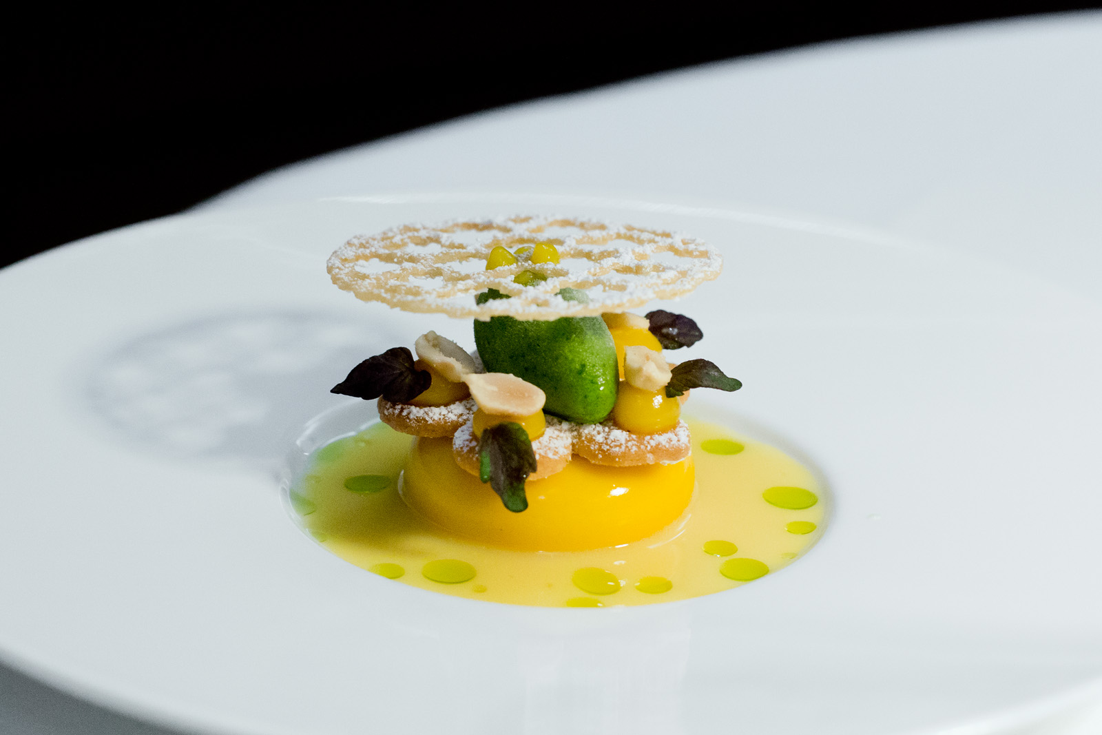 Das Service-Team agiert sehr aufmerksam und professionell. Trotzdem hat es Platz für Lockerheit und spannende Geschichten – so lieben wir das. Das Menü offenbart den Gästen zwei Optionen: zum einen kann man sich aus verschiedenen Vorspeisen, Hauptgängen und Desserts sein 3-Gänge-Menü für 330 € zusammenstellen (dazu gibt es 5 Appetizers, Friandises usw.) oder man wählt das Tasting Menu in 8 Gängen (dazu gibt es ebenfalls die Appetizers und Friandises) zu 395 €. Natürlich wählen wir die grosse Option. Interessant: Auf der Karte steht vor jedem Gericht das Jahr, in dem es erstmals serviert wurde. Dabei fällt auf, dass man sich hier nicht auf den Lorbeeren ausruht, sondern laufend neue Gerichte entwickelt und ins Menü einbaut. So stammt die Mehrzahl der heute servierten Kreationen aus den letzten beiden Jahren.