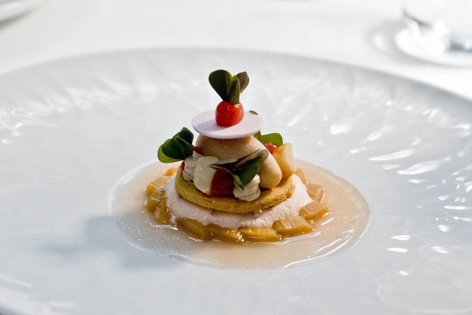 Für einen Aufpreis von 18 Franken wird noch ein Käsegang (7/10) serviert. Die Kombination zwischen dem Jersey Blue, den Physalis und der Haselnuss funktioniert sehr gut. Danach ist Zeit für etwas Süsses. Gleich zwei Desserts sind auf dem Menü. Wir starten mit dem hervorragenden Passionsfrucht-Dessert (8/10), welches dank dem Thai-Basilkum und der Erdnuss einen spannenden asiatischen Touch hat. Das zweite Dessert widmet sich der Rhabarber (7/10) und gefällt uns nicht nur wegen dem schönen Geschmacksbild, sondern auch dank den knusprigen Komponenten. Zum kräftigen Espresso, serviert man uns dann noch eine ausgezeichnete Auswahl an Friandises (8/10).