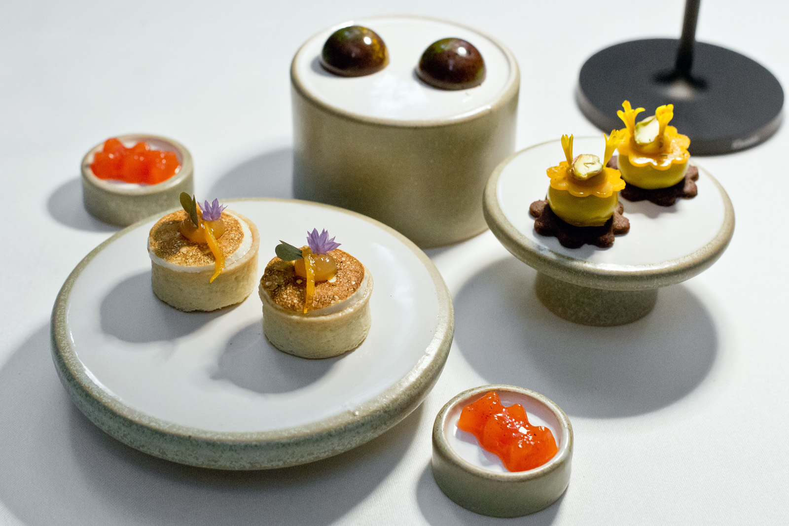 Das zweite Dessert (5/10) ist dann opulenter. Da wir keine Fans von Whysky in Desserts sind, können wir der Nachspeise nicht viel abgewinnen. Es ist zwar eindrücklich inszeniert, für uns aber zu mächtig und der Whysky-Geschmack, zwar gekonnt eingebunden, aber doch zu dominant (5/10). Zum Abschluss gibt es noch eine Etagere mit verschidenen Friandies (7/10).