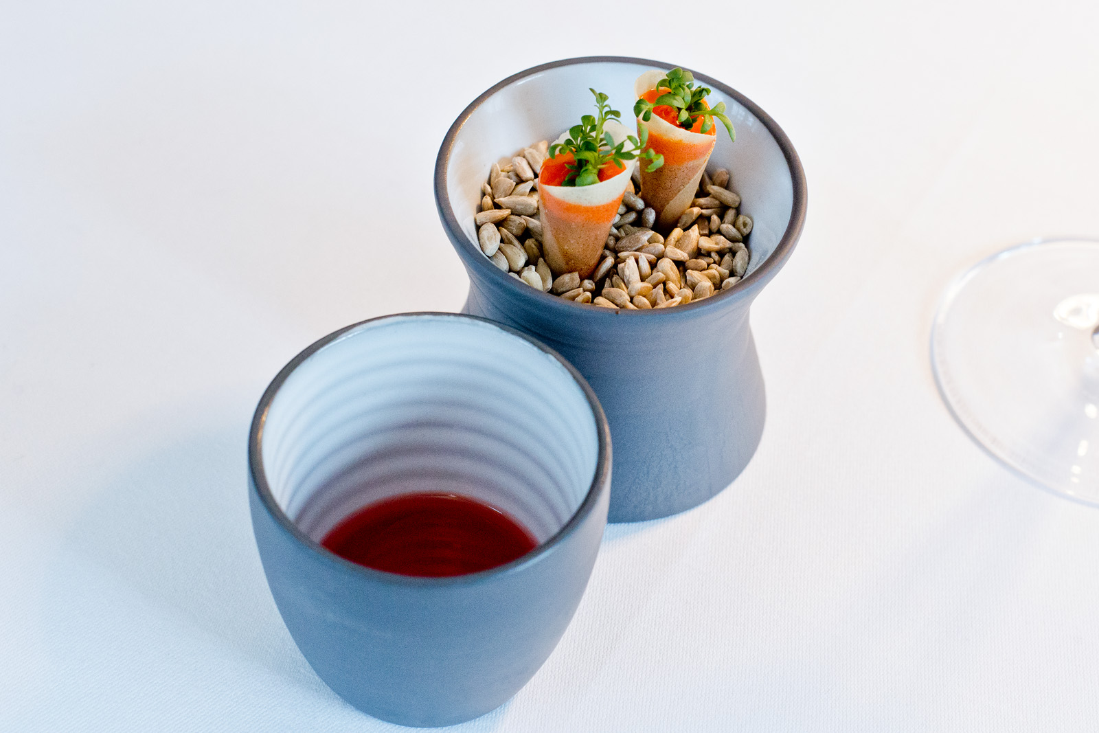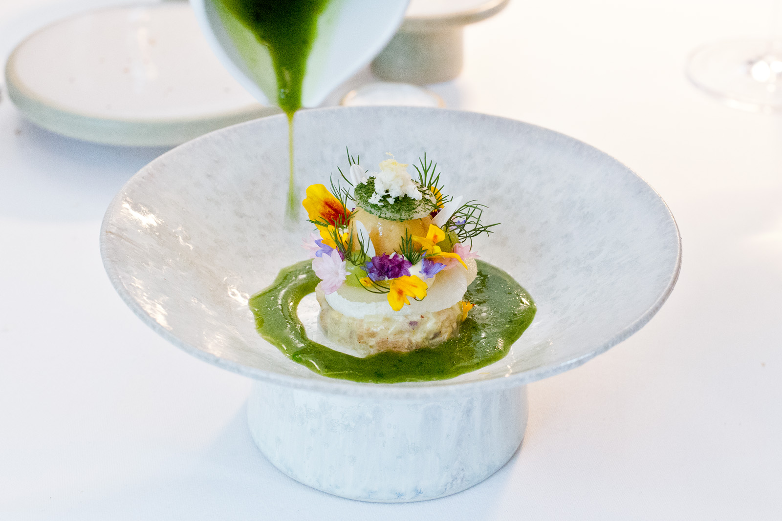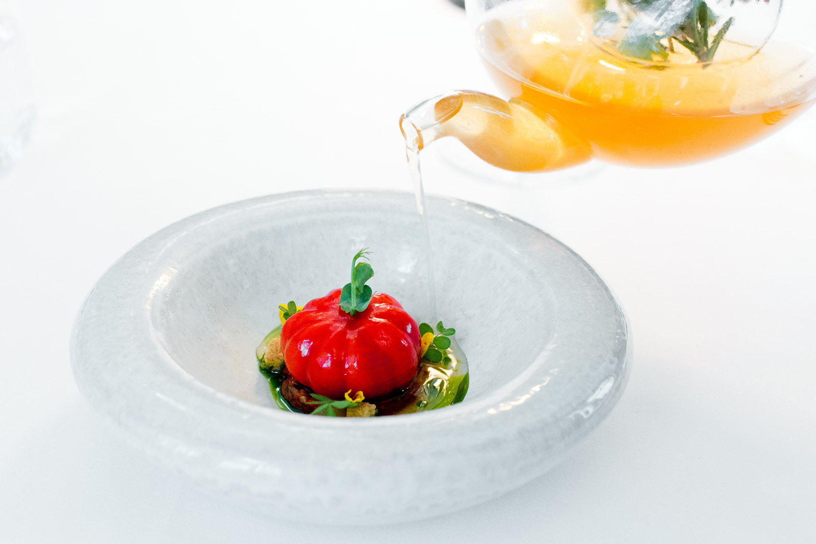 Zur Begrüssung serviert man uns zuerst eine kalte Essenz mit allem, was die eigenen Gärten rund ums Hotel zu bieten haben. Tatsächlich sieht man während dem Tag immer mal wieder Köche durch die Beete ziehen. Auch Chef Masse konnten wir vor einer Stunde beim Kräuter schneiden beobachten. Der Aufwand hat sich gelohnt – es ist faszinierend, wie herbal und vielschichtig dieses Elexier schmeckt.