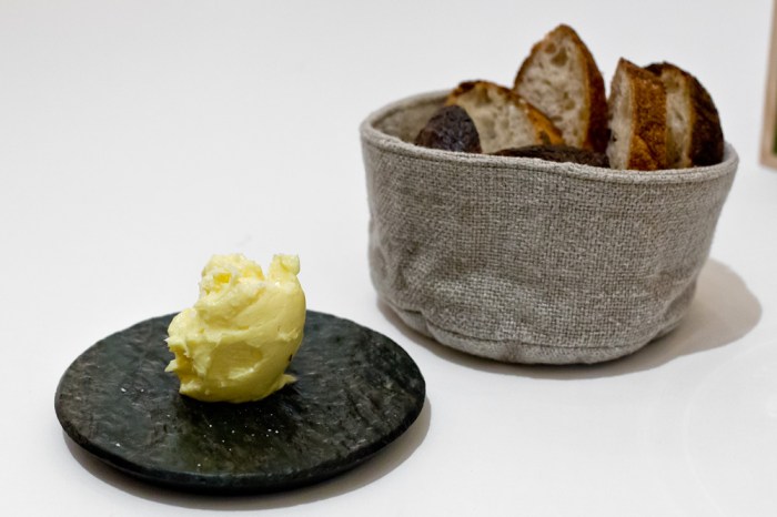 Auf das Sauerteigbrot ist man mächtig stolz. Das Ergebnis der aufwändigen Handarbeit präsentiert man deshalb am Tisch. Danach serviert man uns davon ein paar Tranchen sowie eine Butter aus dem 15 Minuten entfernten Grabs. Das Brot duftet und schmeckt absolut phänomenal. In Kombination mit der Butter ist es ein wahrer Traum und besser als so manches Abendessen.