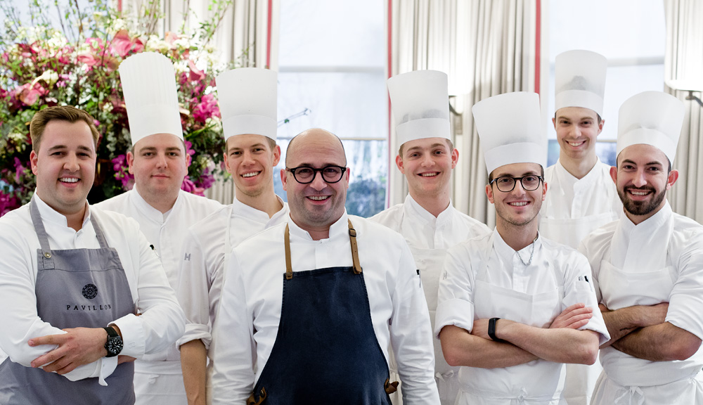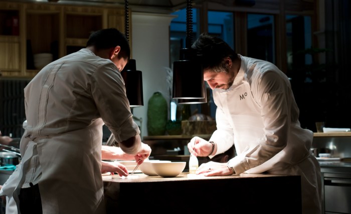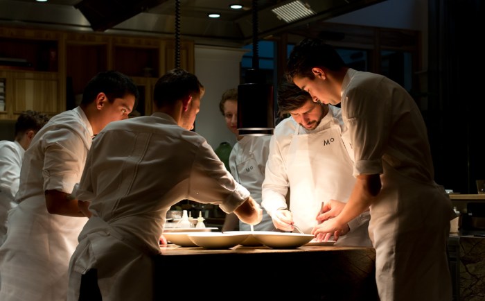 Ein Blick in die Küche zeigt eine konzentrierte Brigade beim Anrichten der Hauptgänge. Langsam nähern wir uns dem Finale.