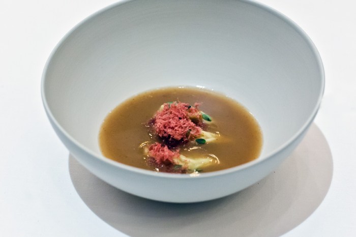 Das zweite Häppchen begeistert uns ebenfalls. Das knusprige Sandwich aus gebackenem Topinambur offenbart einen wohligen und intensiven Geschmack nach Topinambur. Dazu gesellt sich ein animalischer Geschmack vom geräucherten Rinderherz. Die Petitesse hallt noch Minuten später nach. Eindrücklich!