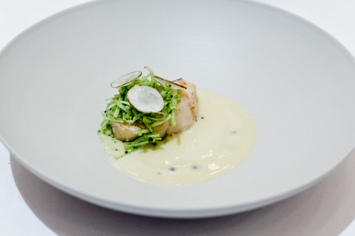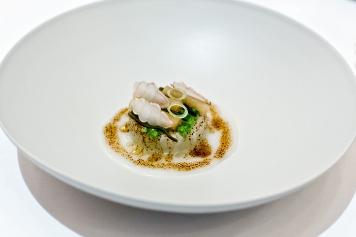 Nun wir uns ein südkoreanisch inspiriertes Gericht serviert. Der Daikonrettich wird in dem asiatichen Land sehr oft in der Küche verwendet. Er hat ein milderes Aroma als der Rettich den wir bei uns kennen, deshalb eignet er sich gut für ein schön balanciertes Gericht wie dieses. Die Basis bildet ein Reismilch-Sud, der mit Shirodashi abgeschmeckt ist. Das Gericht duftet nicht nur stark nach Asien (toll der Koriander), sondern bringt auch alle Vorzüge, die wir an dieser Küche lieben in den Vordergrund. Stark wie Sven wiederum die Säure integriert und mit den unterschiedlichen Konsistenzen arbeitet. Ein absolut harmonisches und geschmacksintensives Erlebnis das uns völlig beeindruckt.