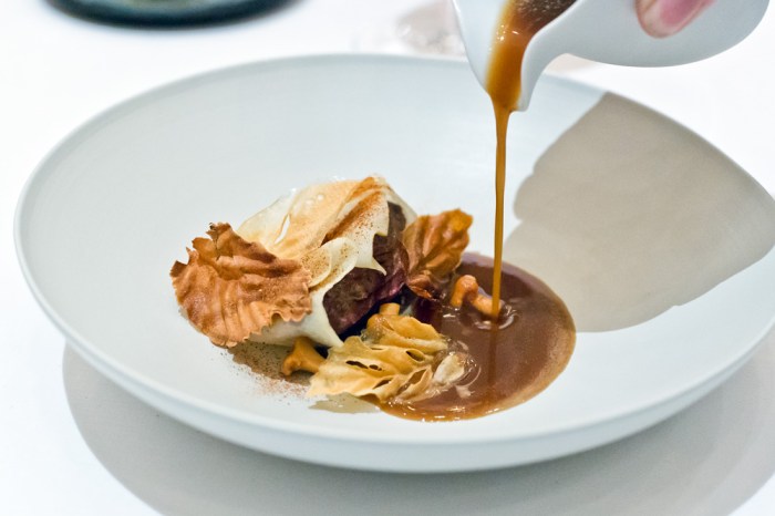 Weiter geht es mit einem Signature Dish von Sven Wassmer. Wir kamen bereits in Vals in den Genuss dieses genialen Gerichts und hofften deshalb insgeheim, dass der Saibling aus dem Val Lumnezia heute nochmals seinen Auftritt hat. Der mit Heu und Tanne geräucherte Fisch ist glasig gegart und duftet himmlisch nach einem Nadelwald kurz nach einem intensiven Sommergewitter. Die Sauce besteht aus Rahm die so stark einreduziert wurde, dass sich das Fett von der Molke trennte. Die Molke wurde dann karamellisiert und wieder mit dem Fett, Milch und Rahm vermengt. Dadurch hat das Gericht auch diese dezente, aber fantastische Süsse. Kurz vor dem Service wird etwas Tannenöl in die Sauce geträufelt. Das Resultat ist grandios. Es schmeckt rauchig, wie an einem Lagerfeuer inmitten eines dichten Waldes. Dieses Bild taucht vor unseren Augen auf, während wir Bissen für Bissen geniessen, ohne auch nur ein Wort zu sprechen.