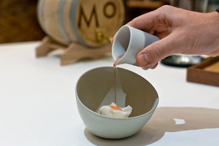Wie schon in Vals, startet der Abend bei Sven Wassmer mit Fingerfood-Snacks, die in verschiedenen Wellen serviert werden. Los geht es mit …