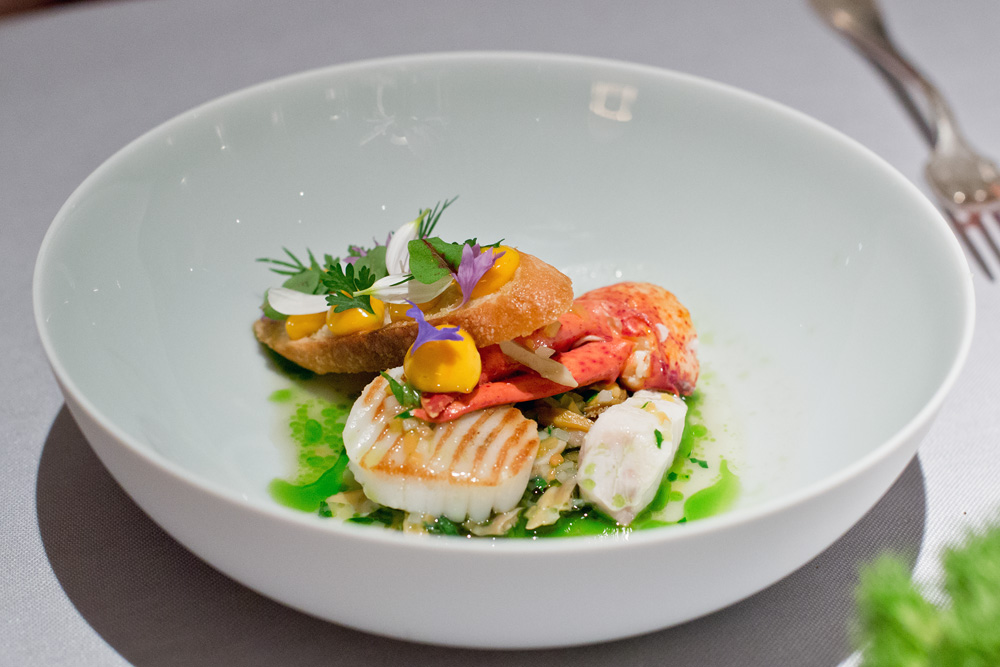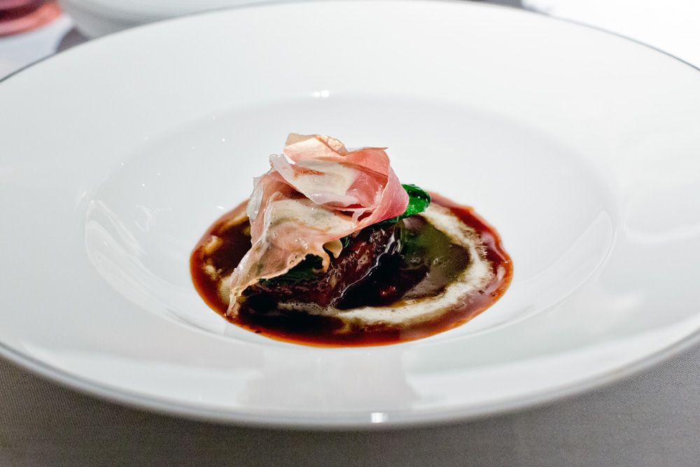 Jetzt wird es innovativ. Es war schon lange Svens Wunsch ein Raclette zu servieren. In einem solchen Menü wäre ein klassisches Raclette zu schwer. Deshalb hat er nach einer anderen Variante geforscht. Zuerst hat er die perfekte Kartoffel gesucht und ist bei der belgischen Sorte „Corne de Gatte“ fündig geworden. Dies wegen der leicht wachsigen Konsistenz und dem nussig-buttrigem Eigenaroma. Beim Käse entschied sich Sven nach langem ausprobieren für einen 18 Monate alten Gruyère und einen 48 Monate alten Sbrinz – den Letzten der noch auf einer Alp in der Innerschweiz hergestellt wird. Die beiden Käsesorten werden im Wasser geschmolzen und danach gemixt damit sich alle Geschmacksstoffe lösen. Danach wird das ganze passiert und à la minute mit Kuzu – einem ursprünglich aus Asien stammenden Bindemittel gebunden. Das Kuzu gibt dem Käsewasser eine extrem sämige und glänzende Konsistenz. Dadurch hat man sozusagen den geschmolzenen Käse, allerdings ohne das ganze Fett. Darüber wird Périgord Trüffel gehobelt. Von uns gibt es grossen Applaus, zum einen wegen dem genialen Geschmack zum anderen für die Kreativität und Passion die Sven mit diesem Gericht demonstriert.